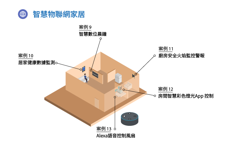 透過「智能數位鬧鐘」和「家居健康監察系統」製作一個顯示有用信息的時鐘,例如當前時間、溫度、濕度和家居空氣質數指標;「廚房火災警報系統」可以提示房主在房屋著火時立即採取行動。「智能遙控燈泡」可讓您透過智能手機按制家居內的燈光顏色; 您也可透過Amazon Alexa語音服務,聲控風扇的開關和強弱。
