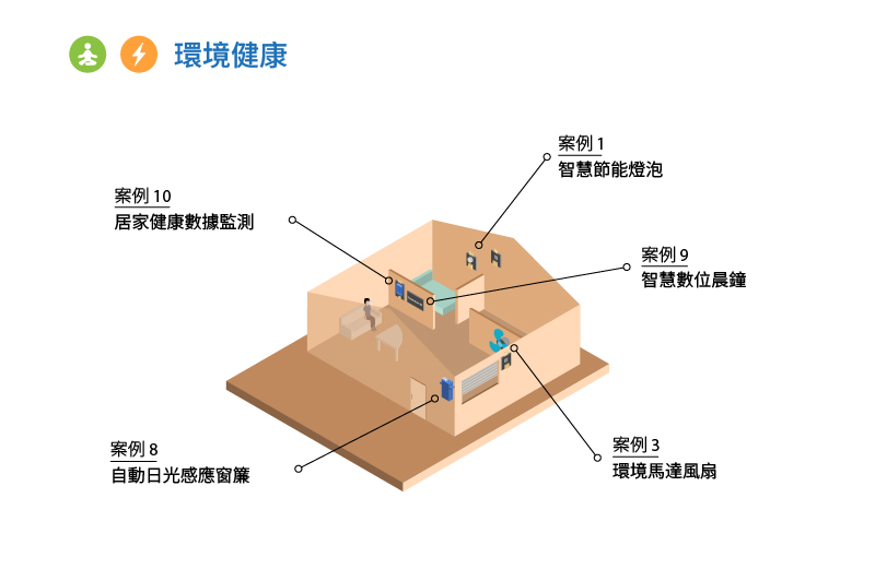 「智能燈泡」能有助節能減碳,當沒有人使用時,燈泡便會自動關閉;「智能窗簾」將阻擋大量陽光照射入家中,減低室內溫度;「家居健康監察系統」會監察家居的環境狀況,並可透過智能風扇調節居所的溫濕度,節省能源消耗;「智能數位鬧鐘」可協助屋主建立一個規律的生活習慣。